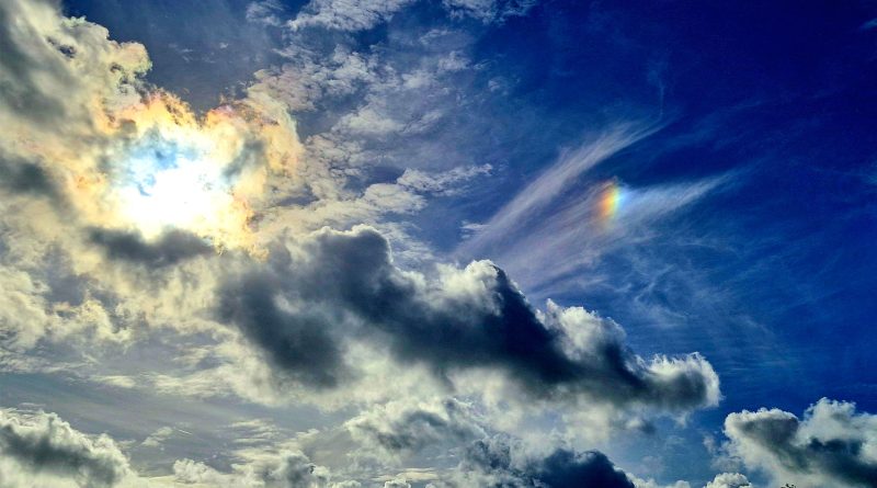 De foto toont een prachtige, deels bewolkte hemel. Links op het beeld schijnt de zon fel door een wolkenlaag heen,