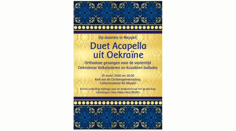 Op 25 maart treedt duet Acapella uit Oekraïne op in de kerk van de Christengemeenschap aan de Catharinastraat 44. Duet