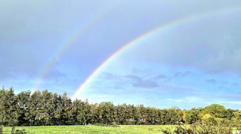 Lees meerDe foto toont een prachtig landschap met een dubbele regenboog aan de hemel. De regenbogen buigen sierlijk boven een rij