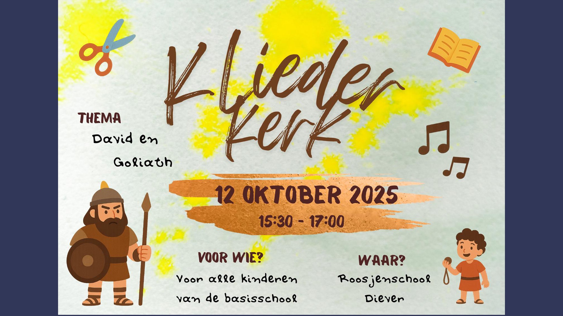 Een spannend verhaal uit de Bijbel dat tot de verbeelding spreekt; de kleine herdersjongen David verslaat de grote reus Goliath. Maar hoe deed hij dat nou eigenlijk? En wat kunnen wij zelf van dit verhaal leren? Kom het ontdekken tijdens de Kliederkerk. Een spel, een knutsel, een Bijbelverhaal, samen zingen, bidden en samen eten. Voor alle kinderen van de basisschool samen met hun (groot)ouders. Jij komt toch ook? 12 oktober a.s. Locatie: Roosjenschool Diever, Hoofdstraat 23. Start: 15.30 uur.