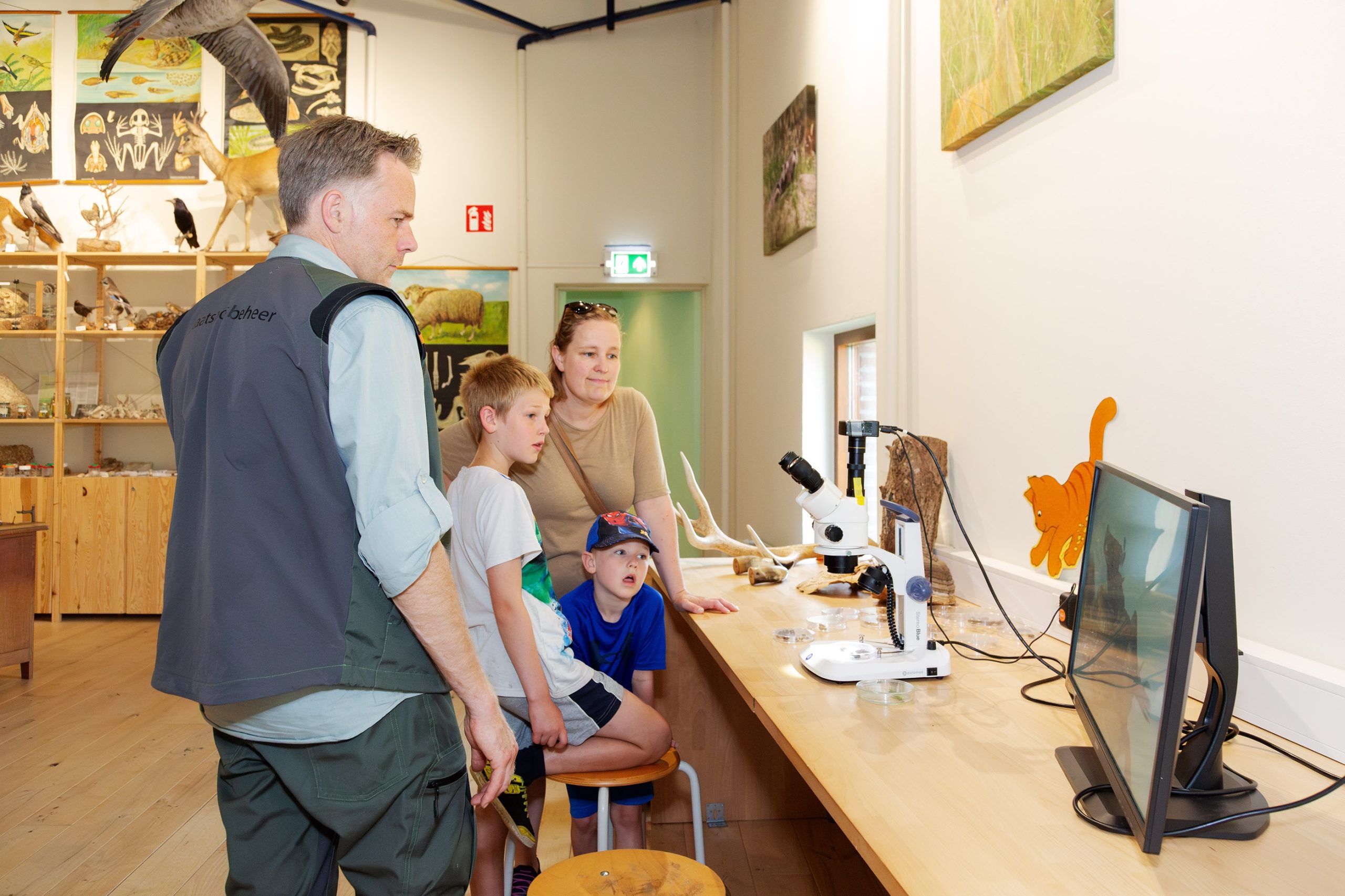 De microscoop staat in het “Boswachterslab”, het “kantoor” van de boswachter. Hier bevinden zich allerlei bijzondere vondsten uit de natuur, waaronder vogelnestjes, schedels, veren, vogeleieren, opgezette dieren en nog veel meer. Deze dag is een initiatief van de Faculteit Science and Engineering van de Rijksuniversiteit in Groningen.