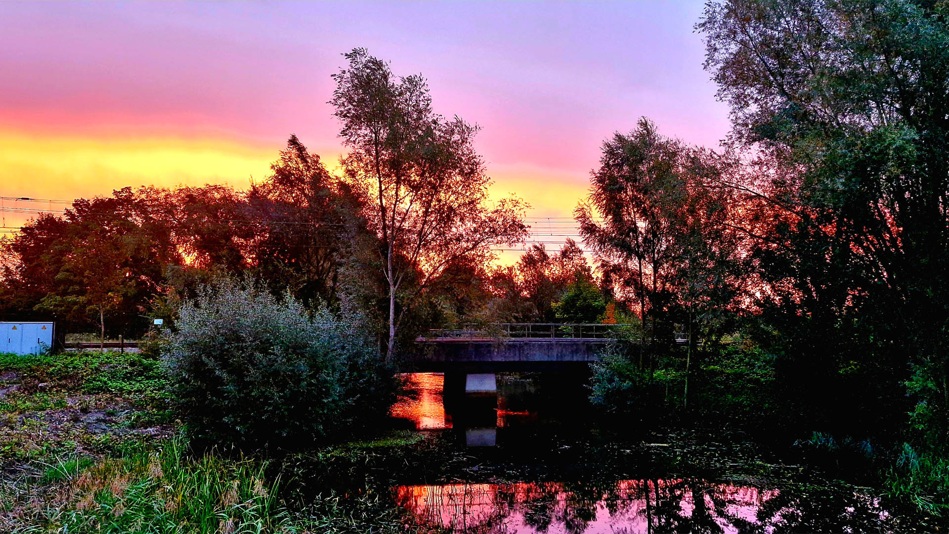Op de vroege vrijdagochtend, om 07.15 uur, werpt de opkomende zon een vurige gloed over het riviertje De Reest, ter hoogte van de kruising tussen de Eestlaan en de Leonard Springerlaan. De hemel kleurt van paars naar oranje, en het zachte licht weerspiegelt prachtig in het kalme water. Terwijl de stad langzaam ontwaakt, biedt dit stukje natuur een moment van rust en verwondering — een stille herinnering aan de schoonheid van de dag die begint.
