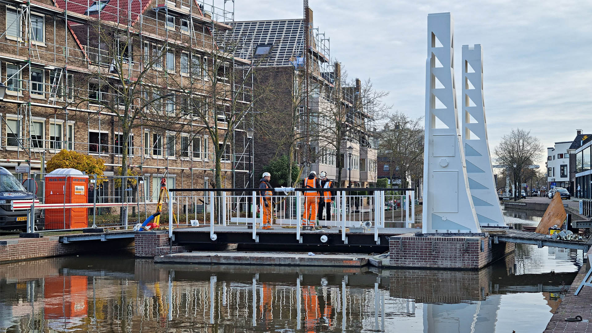 Dinsdag is begonnen met de opbouw van de nieuwe Boazbrug in het centrum van Meppel. De fietsbrug, die de oude houten brug vervangt, krijgt een moderne uitstraling met de uitstraling van de andere bruggen over de gracht. Bouwvakkers zijn momenteel bezig met het monteren van de stalen onderdelen en het aansluiten van de technische systemen. De brug wordt voorzien van duurzame materialen en een energiezuinige aandrijving, passend binnen de ambities van de gemeente om de stad toekomstbestendig te maken.