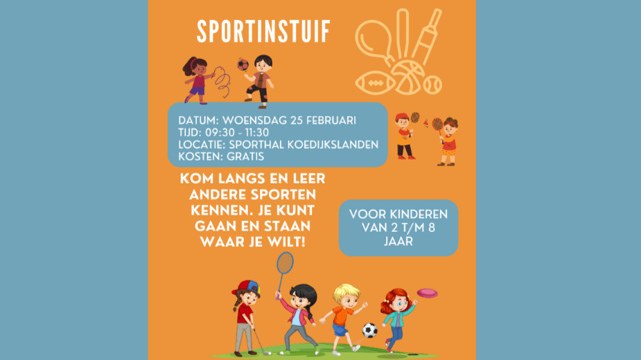 Op woensdag 25 februari houdt Meppel Actief een gezellige en actieve sportinstuif in Sporthal Koedijkslanden. Van 9.30 tot 11.30 uur kunnen kinderen in de leeftijd van 2 tot en met 8 jaar spelenderwijs kennismaken met verschillende sporten. Tijdens deze ochtend zijn diverse sportaanbieders aanwezig om leuke en uitdagende activiteiten aan te bieden. Zo krijgen jonge kinderen de kans om te ontdekken welke sport het beste bij hen past. rennen, springen, klimmen, gooien, alles komt voorbij in een veilige en stimulerende omgeving.