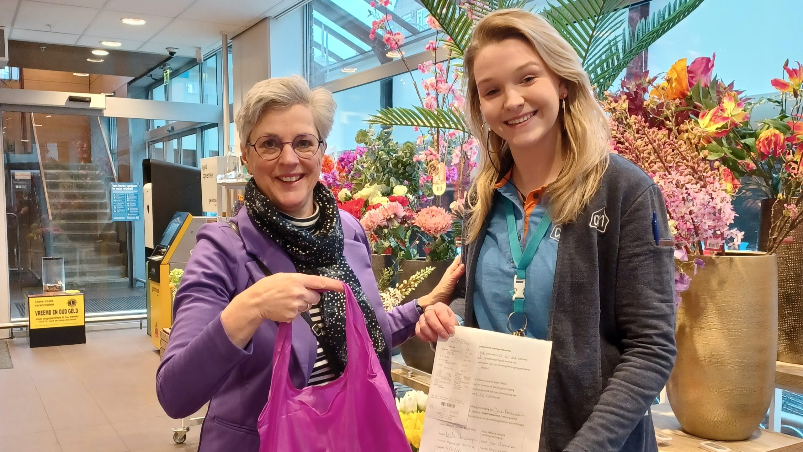 Donderdag overhandigde Lizzy van AH-centrum de opbrengst van € 239,50 van de statiegeldactie aan Joke Berendsen van de Hersenstichting.
