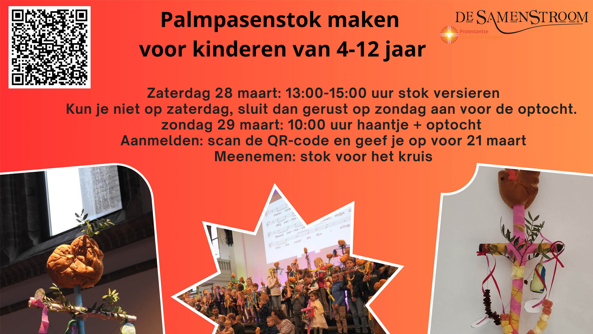 In aanloop naar Palmpasen bruist het in De Samenstroom in Meppel. Kinderen van 0 tot 12 jaar zijn uitgenodigd om mee te doen aan de traditionele Palmpasenoptocht. Op zaterdag 28 maart (13.00-15.00 uur) kunnen kinderen van 4 tot 12 jaar hun Palmpasenstok versieren; materialen zijn aanwezig. Zondag 29 maart (10.00-10.45 uur) maken de jongsten hun stok tijdens de Kliederkerk. Kinderen nemen zelf een stok of kruis mee. Aanmelden kan tot 21 maart via de website. Hoogtepunt is de feestelijke optocht door de kerk op zondag om 10.00 uur, een vrolijk moment voor jong en oud.