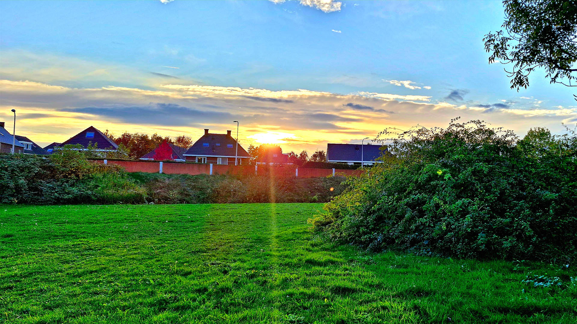 In de wijk Berggierslanden in Meppel zakt de zon langzaam achter de daken van stille huizen. Het warme licht schildert de lucht in tinten van goud en oranje, terwijl de schaduwen over het groene grasveld kruipen. Een zachte bries ruist door de struiken, en een enkele vogel zingt zijn avondlied. Kinderen zijn naar binnen, lichten gaan aan. Alles ademt rust. Het is zo’n moment waarop de tijd even lijkt stil te staan. Hier, tussen natuur en buurt, voel je hoe de dag afscheid neemt met een belofte: morgen begint weer met nieuw licht, nieuwe kansen en dezelfde stille schoonheid.