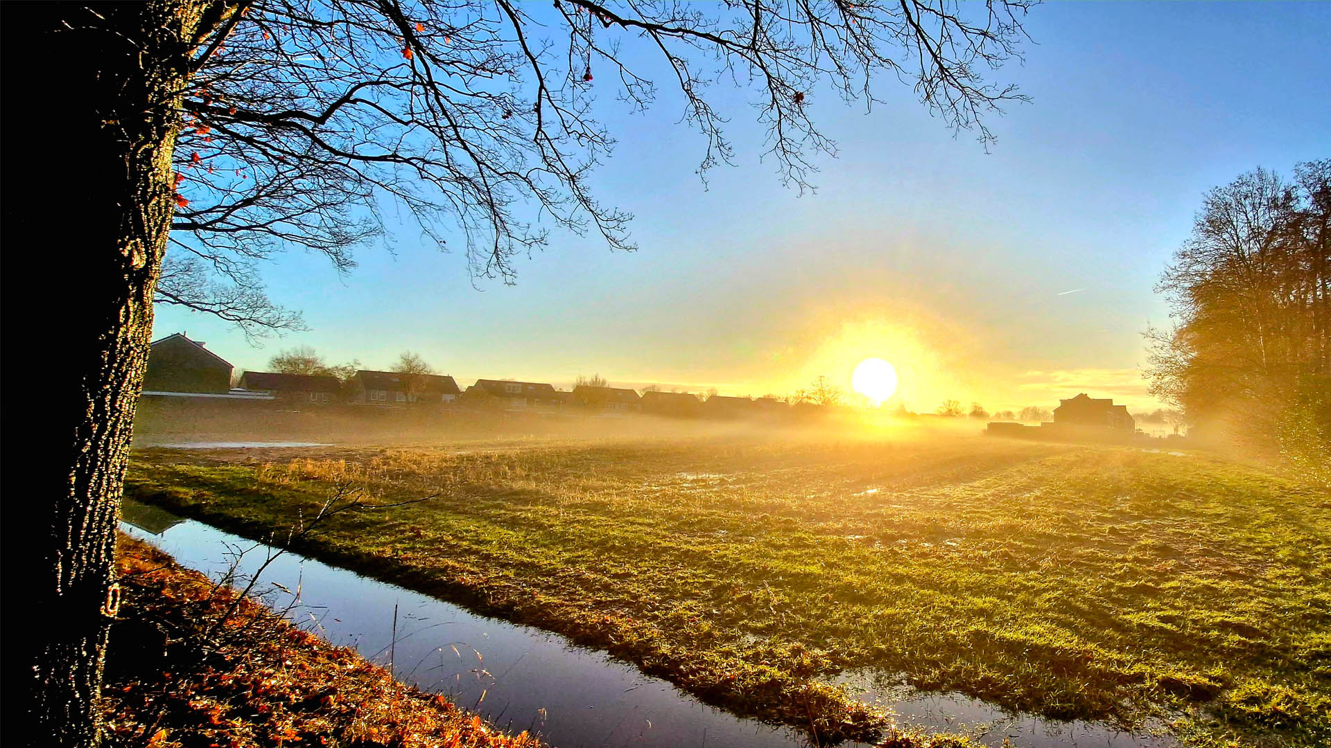 In de vroege ochtend ligt het land bij Staphorst stil te ademen. Vanaf de Westerstouwe bij Meppel schuift het licht voorzichtig over het veld, waar nevel als een dunne sluier boven het gras hangt. De zon klimt laag en goud, zet de sloot in vuur en vlam en tekent lange schaduwen langs de akkers. Kale takken kaderen de hemel, terwijl huizen aan de horizon nog slapen. Het is een moment van belofte: koud en helder, eenvoudig en groots tegelijk. Een ochtend die fluistert in plaats van spreekt.