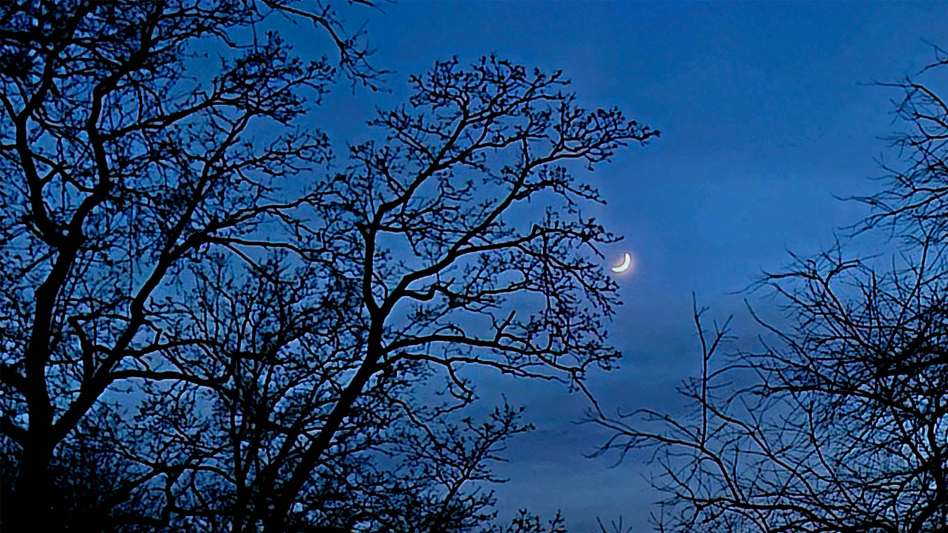 De foto toont een stille winteravond waarin kale bomen hun donkere silhouetten aftekenen tegen een diepblauwe hemel. De takken lijken fragiel en verstild, alsof ze de kou vasthouden na een lange dag. Tussen de wolken verschijnt een dunne maansikkel, zacht lichtgevend en bijna kwetsbaar, die de scène een dromerige sfeer geeft. De lucht voelt helder en ijzig, terwijl de stilte van de natuur overheerst. Alles ademt rust en een lichte melancholie, typisch voor een koude winteravond waarop de tijd even lijkt stil te staan en de nacht langzaam bezit neemt van het landschap, onder een eindeloze hemel vol winterse belofte.