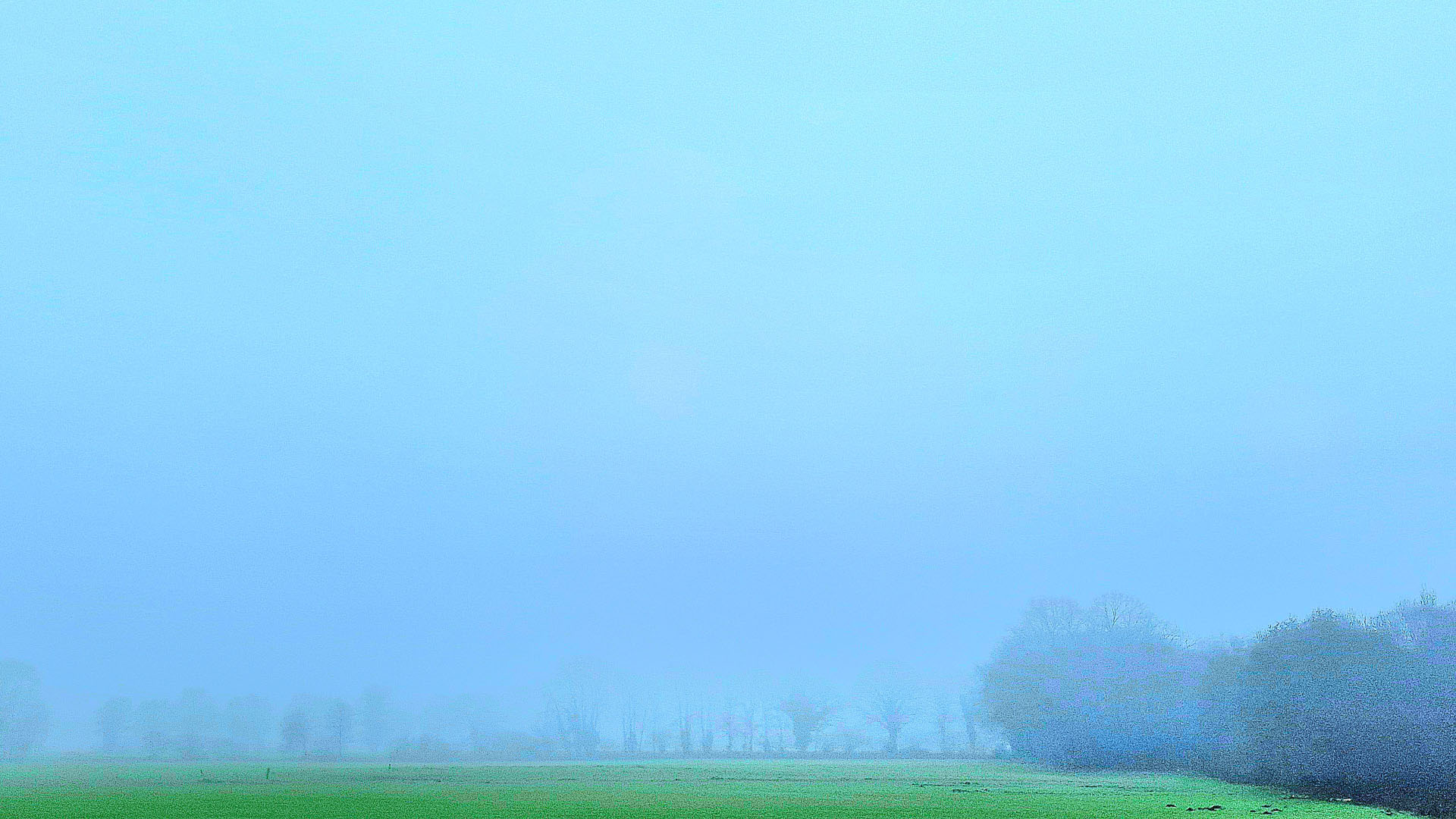 Een zachte, blauwgrijze mist hangt als een deken over het landschap. De ochtend is stil; geluiden lijken te worden opgeslokt door de nevel. Groene velden vervagen naar de horizon, waar bomen slechts schimmen zijn. De lucht is helder en koel, het licht diffuus en mild. Het is zo’n zaterdagmorgen die uitnodigt tot vertragen: een rustige ademhaling, een warme kop koffie, en even nergens naartoe hoeven.