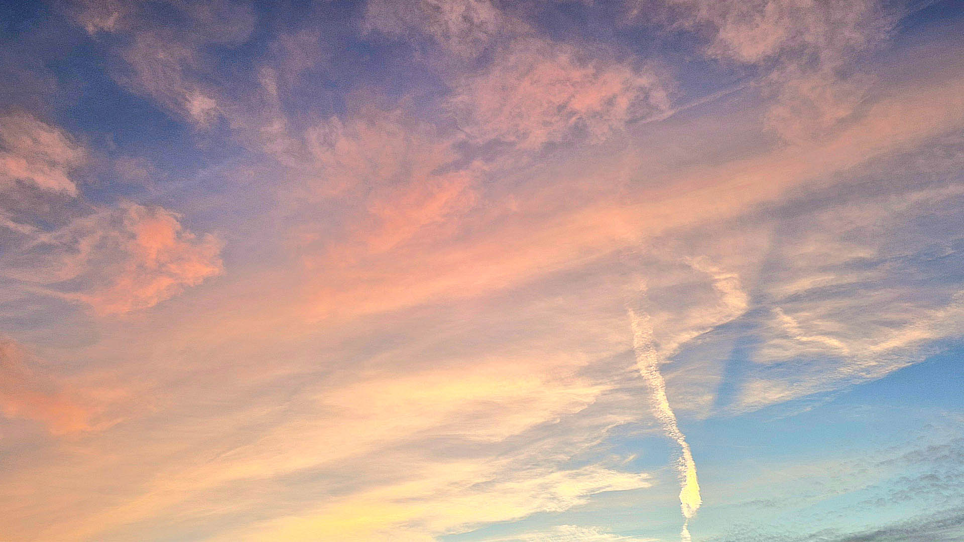 Een zachte, kleurrijke wolkenlucht bij zonsondergang. De lucht kleurt pastel met tinten roze, oranje en blauw. Dunne, veerachtige wolken (cirrus) waaieren uit over de hemel. Rechts loopt een opvallende, kronkelende condensstreep van een vliegtuig schuin naar beneden, als een witte penseelstreek. Het geheel geeft een rustige, dromerige sfeer, met een geleidelijke overgang van warm licht naar koeler blauw.