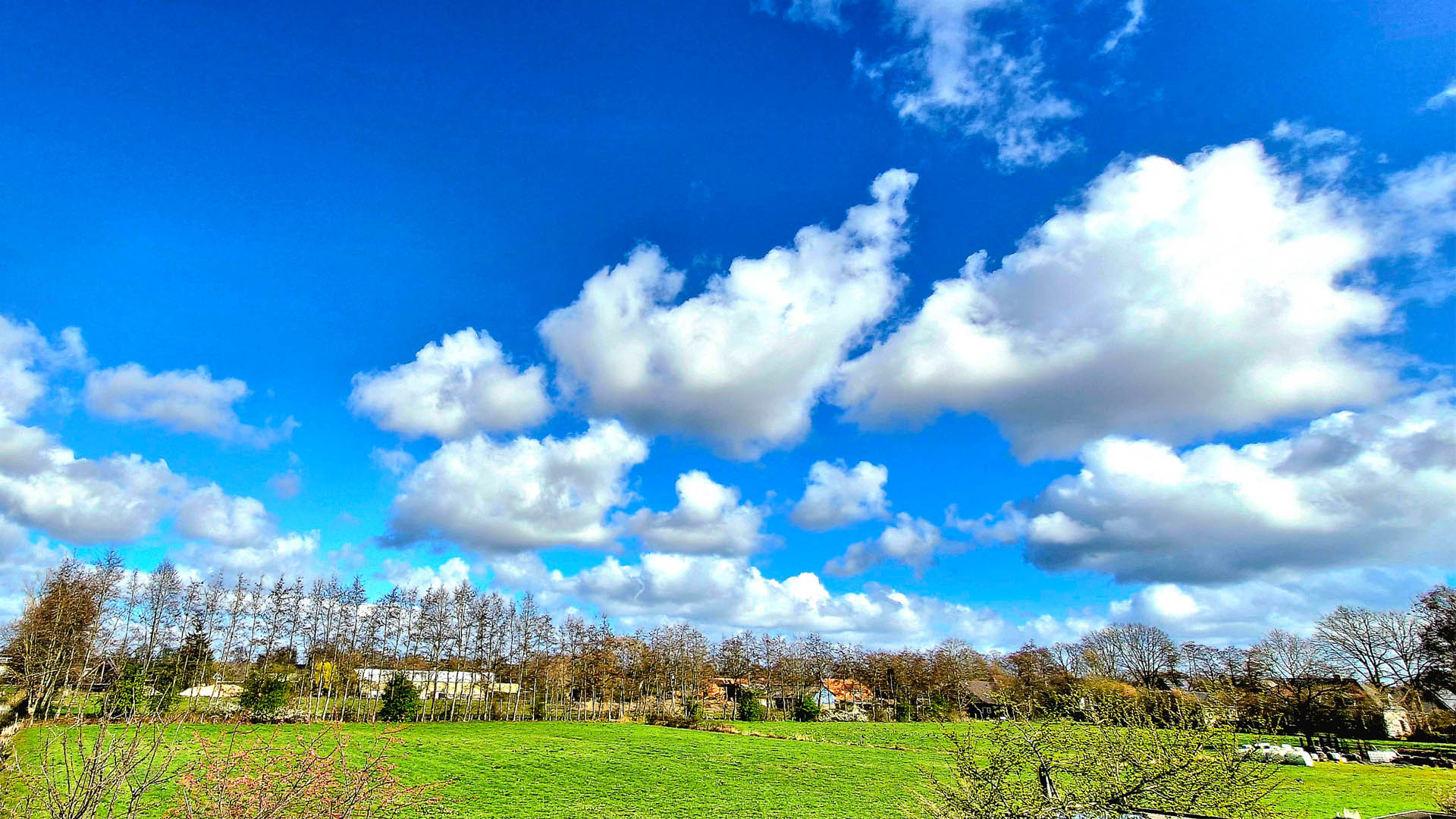 Een fris voorjaarslandschap met een uitgestrekt, helder groen veld onder een diepblauwe lucht. Witte, pluizige wolken drijven rustig voorbij en geven het beeld een levendige, open sfeer. Aan de horizon staan nog kale of net ontluikende bomen, terwijl enkele huizen tussen het groen verscholen liggen. Het geheel straalt rust, ruimte en de eerste tekenen van nieuw leven uit.