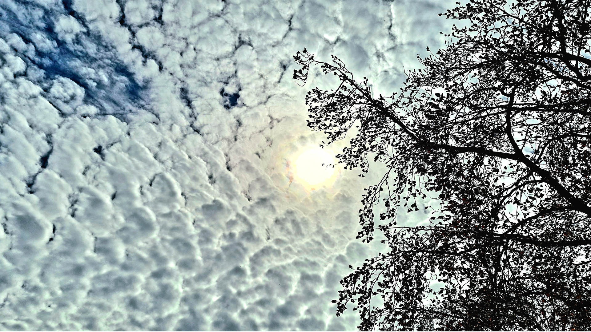 Het weer op de foto is halfbewolkt. De lucht is gevuld met veel kleine, dichte wolken die een patroon vormen, maar de zon schijnt er nog deels doorheen. Daardoor ontstaat een zacht, diffuus licht met een lichte gloed rond de zon. Het lijkt droog en redelijk helder, zonder neerslag. De silhouetten van boomtakken wijzen op weinig wind. Over het algemeen oogt het als rustig, licht bewolkt weer met af en toe zon.