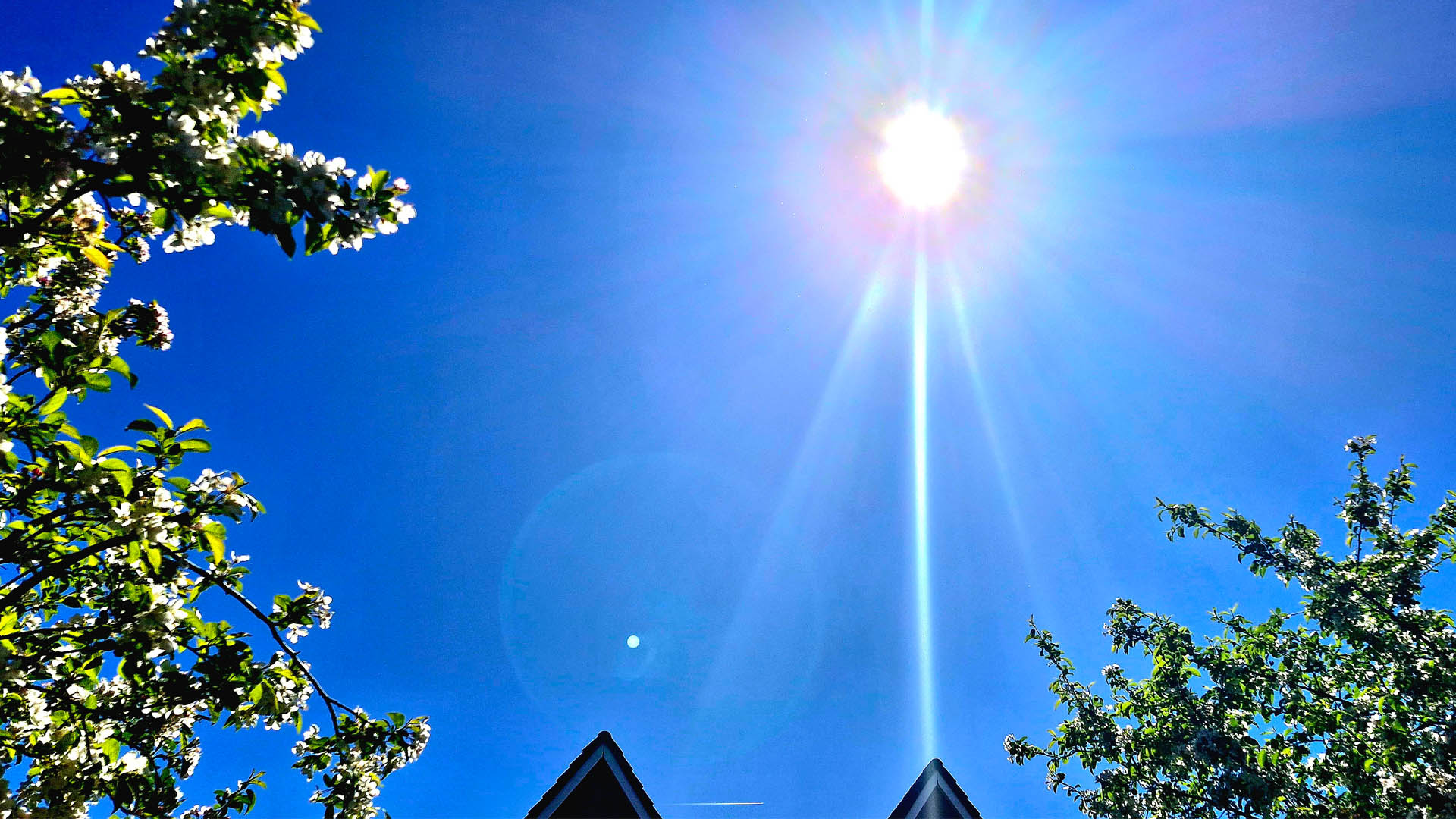 Een stralend zonnige dag met een helderblauwe lucht. Deze week vaak te zien. De zon staat hoog aan de hemel en verspreidt sterke lichtstralen, zichtbaar als een lensflare. Onderaan zijn de puntdaken van huizen te zien, omringd door groene bomen met bloeiende takken. Het geheel geeft een frisse, lenteachtige sfeer met volop licht en groei. De lucht is vrijwel wolkenloos, wat duidt op stabiel en warm weer.