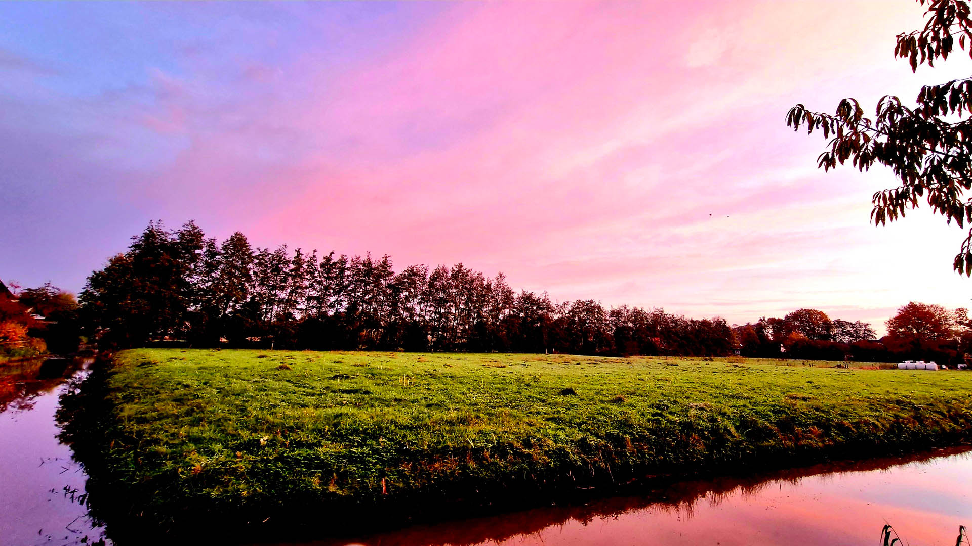 Deze foto, gemaakt op 4 november rond half acht in de buurt van de Berggierslanden in Meppel, toont een serene zonsopkomst boven een groen weiland. De lucht kleurt in betoverende tinten roze, paars en zacht oranje, die weerspiegeld worden in het rustige water van de sloot langs de rand van het veld. Aan de horizon vormt een rij bomen een donkere silhouetlijn tegen het kleurrijke ochtendlicht. De eerste zonnestralen verlichten het landschap subtiel, terwijl de rust van de vroege ochtend voelbaar is. Een moment van stilte en schoonheid in de overgang van nacht naar dag.